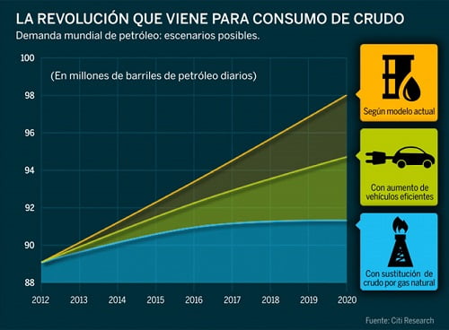 Sin embargo, algunos analistas han empezado a dibujar un nuevo escenario en que el consumo mundial de petróleo, lejos de crecer de manera continua, puede incluso empezar a reducirse en apenas unos años. «La combinación de la acelerada sustitución del petróleo por el gas natural y las mejoras ya en marcha en ahorro de energía son suficientes para prever que el crecimiento de la demanda de crudo puede llegar a su tope mucho antes de lo que los mercados esperan», advierte el centro de análisis de Citi en un informe publicado con el provocativo título de Global oil demand growth. The end is nigh (‘Crecimiento de la demanda global de petróleo. El final está cerca’).